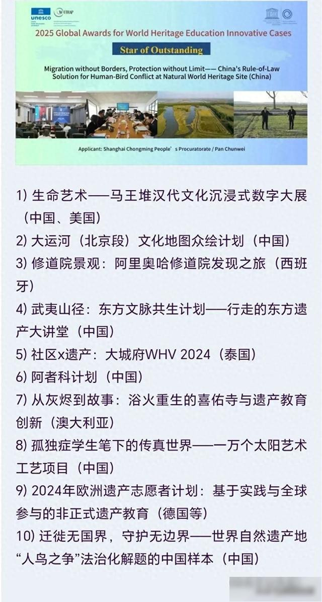 入围2025“全球世界遗产教育创新案例奖”卓越之星十大案例的上海市检察机关“迁徙无国界,守护无边界——世界自然遗产地‘人鸟之争’法治化解题的中国样本”。